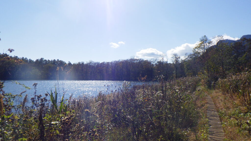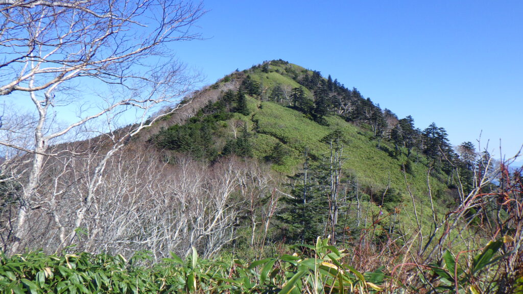 野尻湖を右向こうに見ながら気持ちのよい稜線を歩くと間もなく山頂。