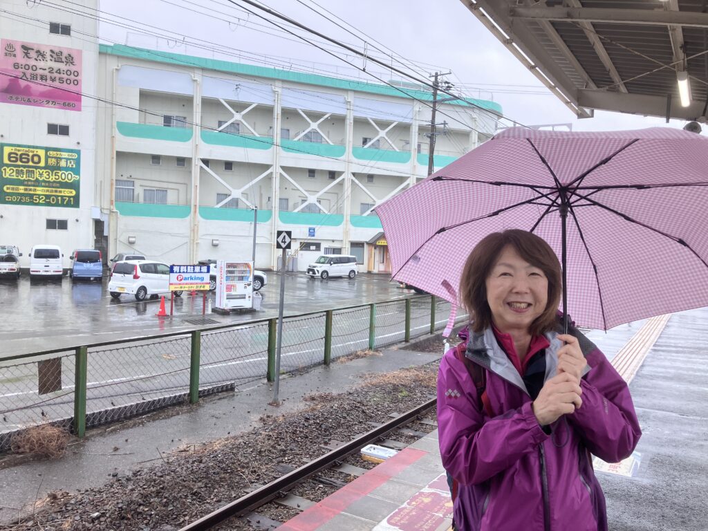 バスで那智勝浦に戻り雨の中、電車とバスを乗り継いで小口の宿に入る作戦。(上の写真は紀伊勝浦駅。前夜はうしろに見えてるビジネスホテルに宿泊。外観はいまいちだけど良いホテルでした。)