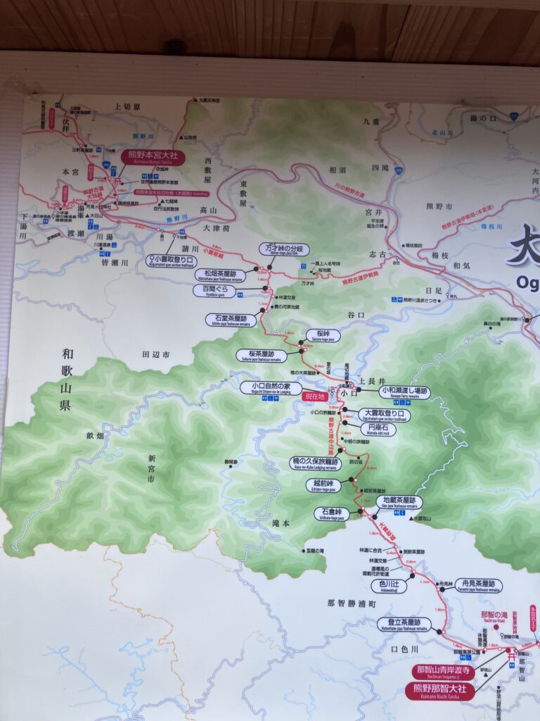 本当は翌日、旅の3日目に那智大社から歩きはじめて、道中半ばの小口に泊まり、4日目で本宮大社までという2日プランだったけど、3日目が100%雨という予報だったのでプラン変更。