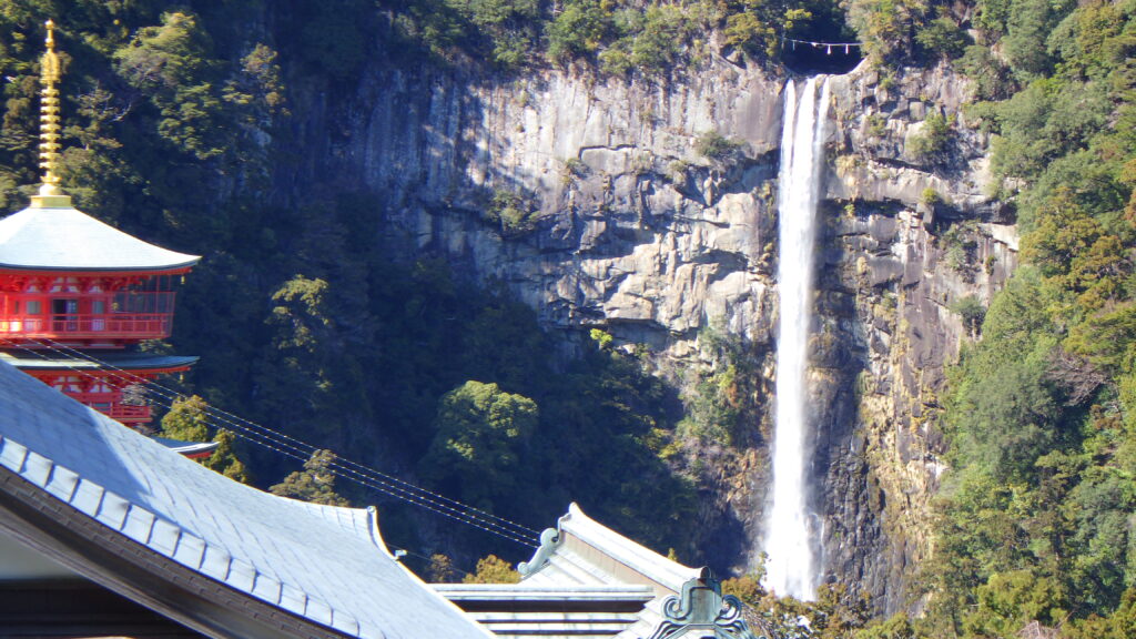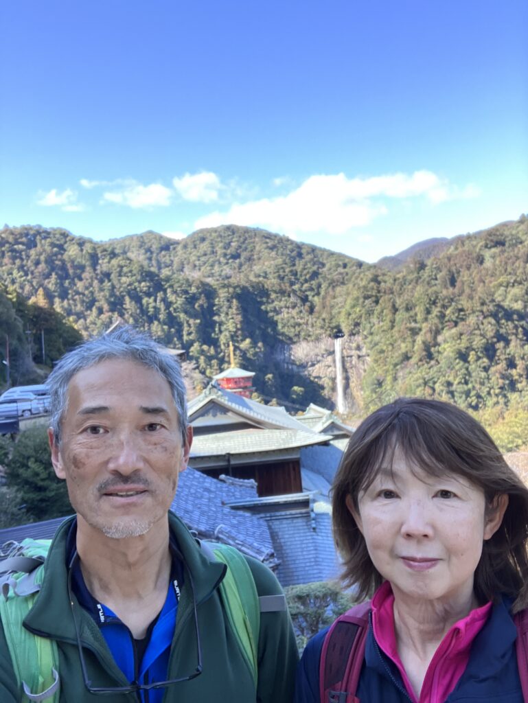 那智の滝をバックに記念撮影。
