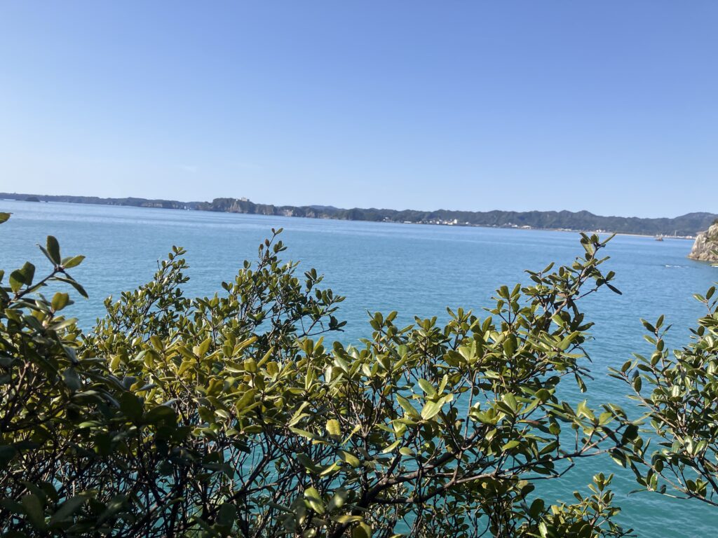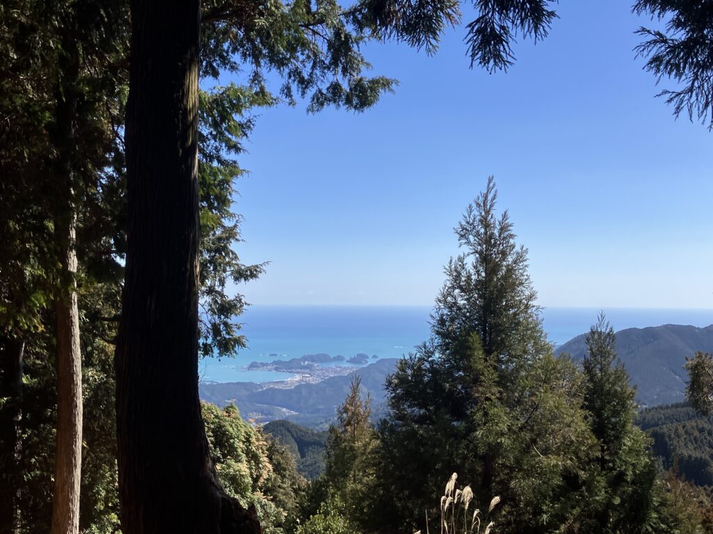 熊野古道と違って広葉樹が多い。樹間にエメラルドグリーンの海が広がってなかなか感動的。