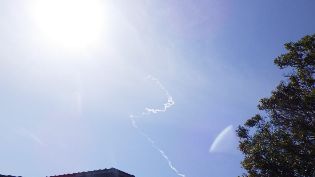 空を見上げるとまさにロケットが飛んでいくところ。