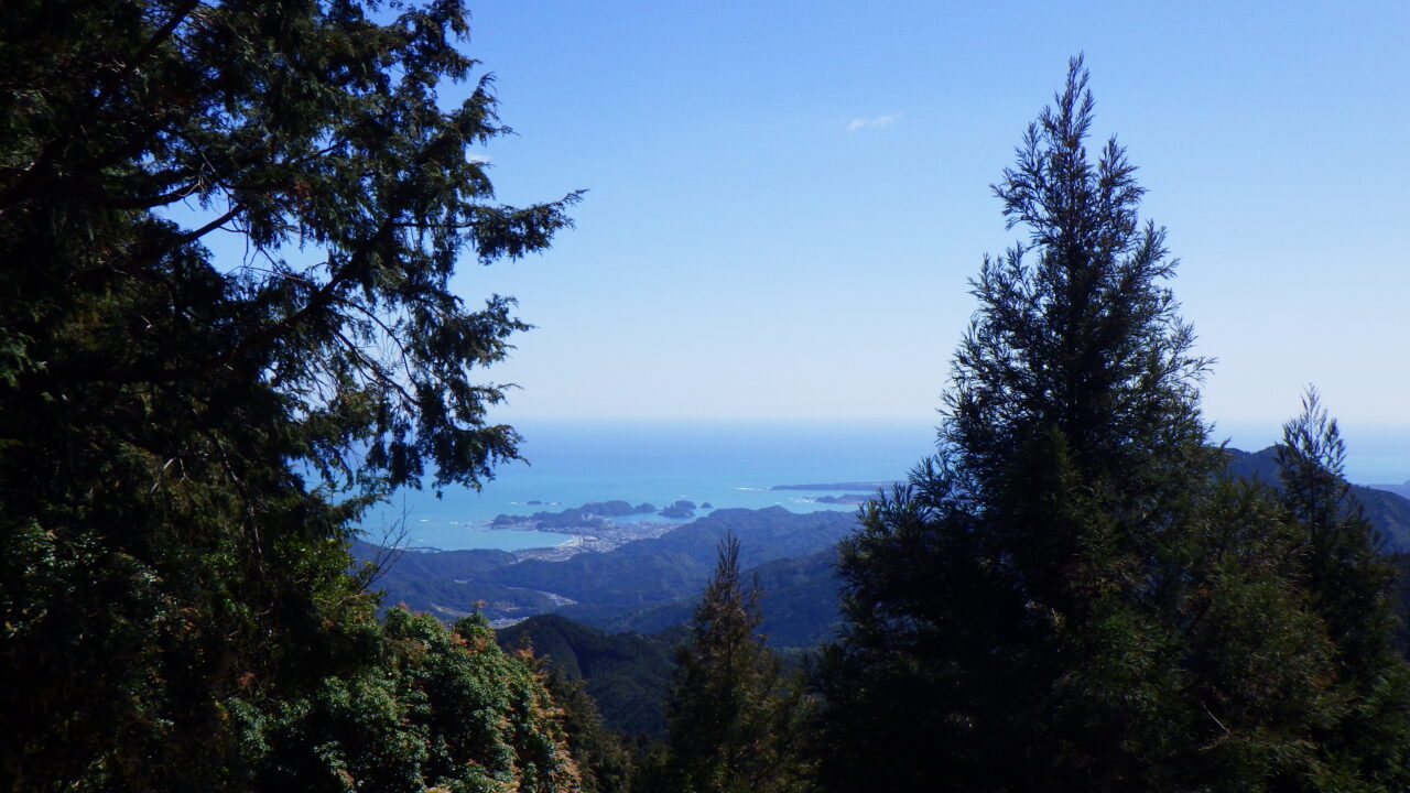 熊野古道と違って広葉樹が多い。樹間にエメラルドグリーンの海が広がってなかなか感動的。