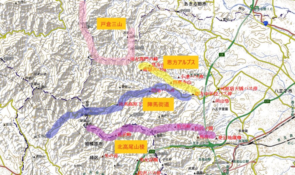 ならば陣馬街道の北辺に連なる恩方アルプス(千手尾根とも言われる)を縦走して弾左衛門の峰まで行ってみよう。